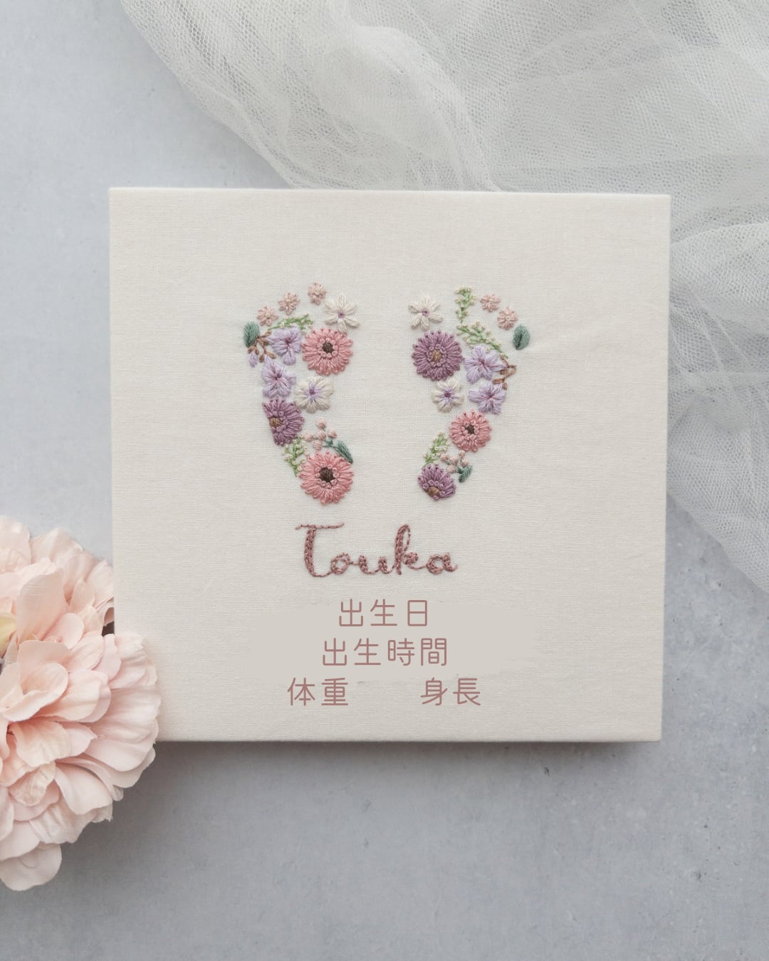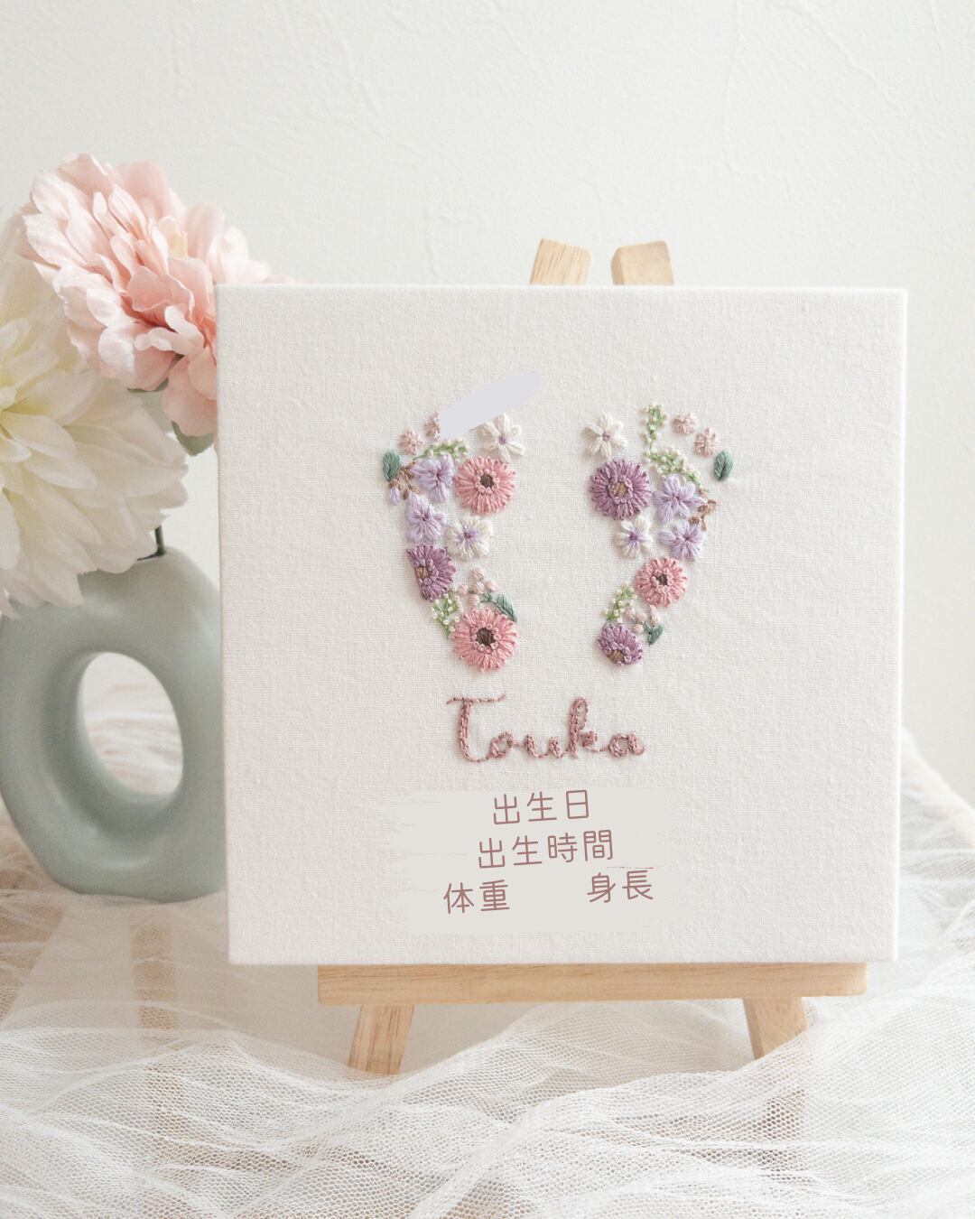【足型・手型フラワー刺繍の命名書】くすみカラーのガーベラ中心デザイン 出産祝い/出生記念/内祝い